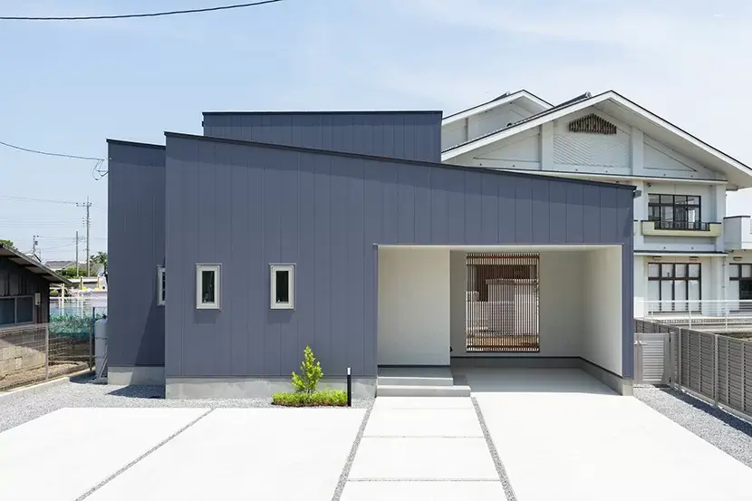 栃木市の街道沿いに建つT様邸。グレーのガルバリウム鋼板と塗り壁を用いたシャープで印象的な外観となっております。