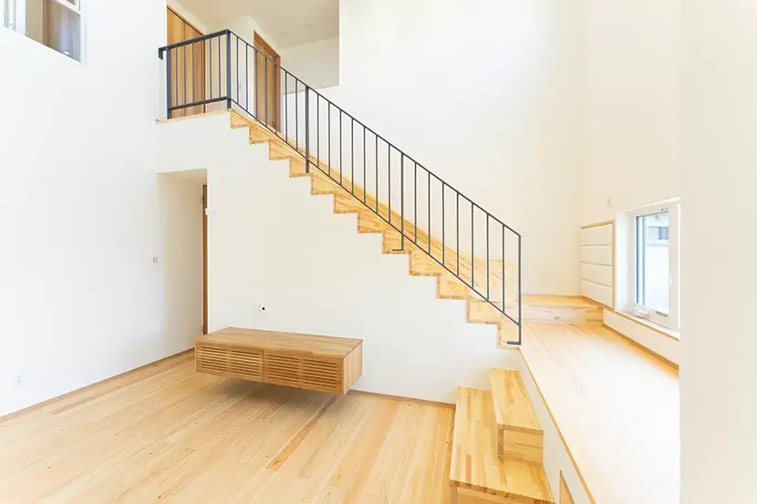 檜の無垢フローチングに珪藻土の塗り壁が柔らかな印象のリビング。吹き抜け階段の隣には、奥さまが幼少期からの夢だったすべり台を併設。毎日笑い声に溢れる明るい住まいです。
