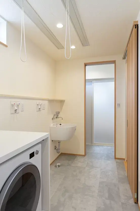 2WAY玄関とキッチン裏の水回り。2つの回遊動線でスッキリ収納の家事ラク動線を実現しました。家族用シュークロークの奥には4人分の個別収納スペース。それぞれの外出用品を収納しています。LDKと洗面脱衣を繋ぐ回遊動線で、洗う・干す・しまうを最短距離で快適に設計。広いランドリールームには乾太くんとスロップシンクを設置し、家事ラク生活を追及しています。