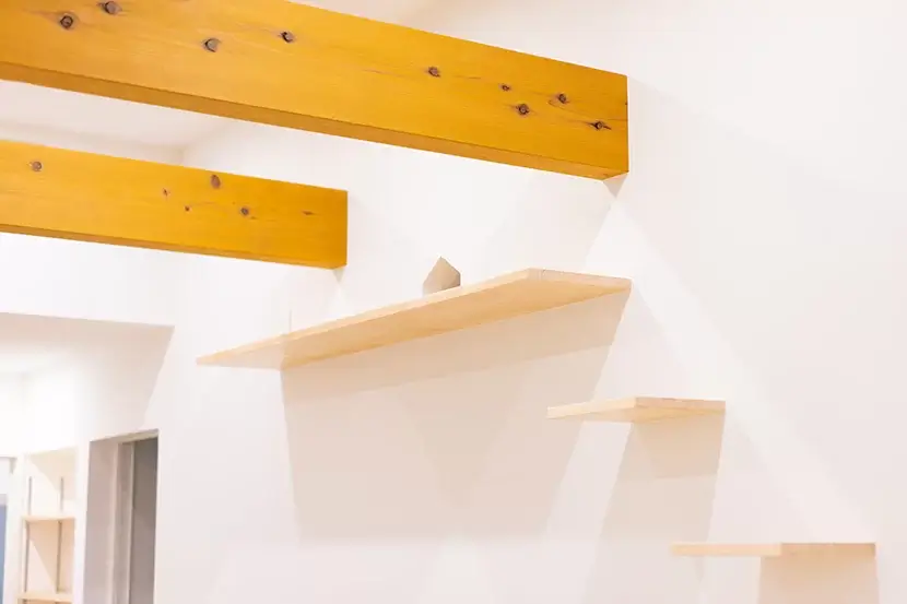 キャットステップ、リビングと寝室を繋ぐ猫窓、リビングの梁など、愛猫との暮らしを楽しむ工夫を随所に設けています。