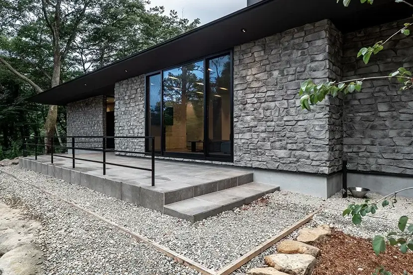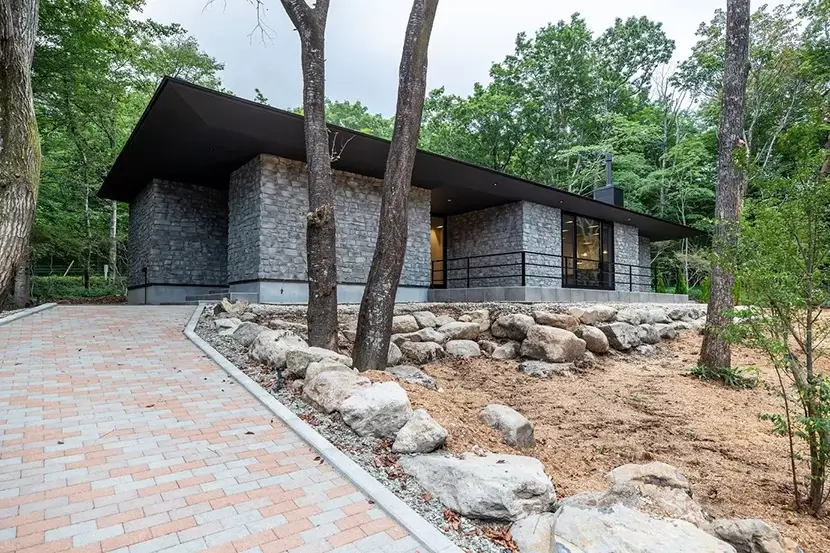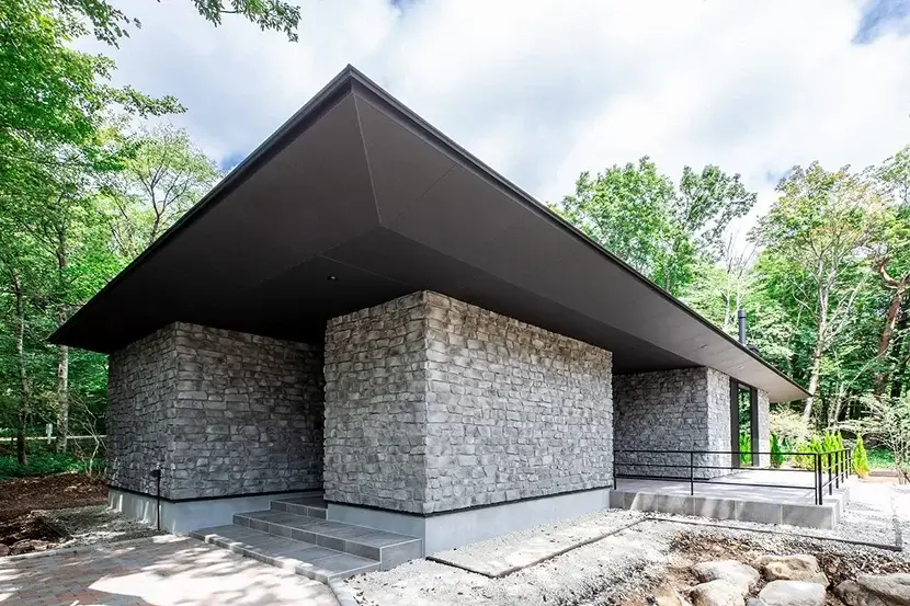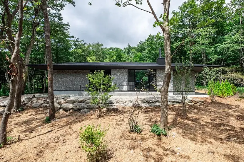 こちらの住まいは、別荘地である那須に建築された平屋のお住い。「石の家」と名付けられた通り、周りの木々とマッチした石を使用した外観デザインが美しく自然に溶け込んでいる。お施主様のご厚意により、事前に問い合わせをすれば見学することが出来る。