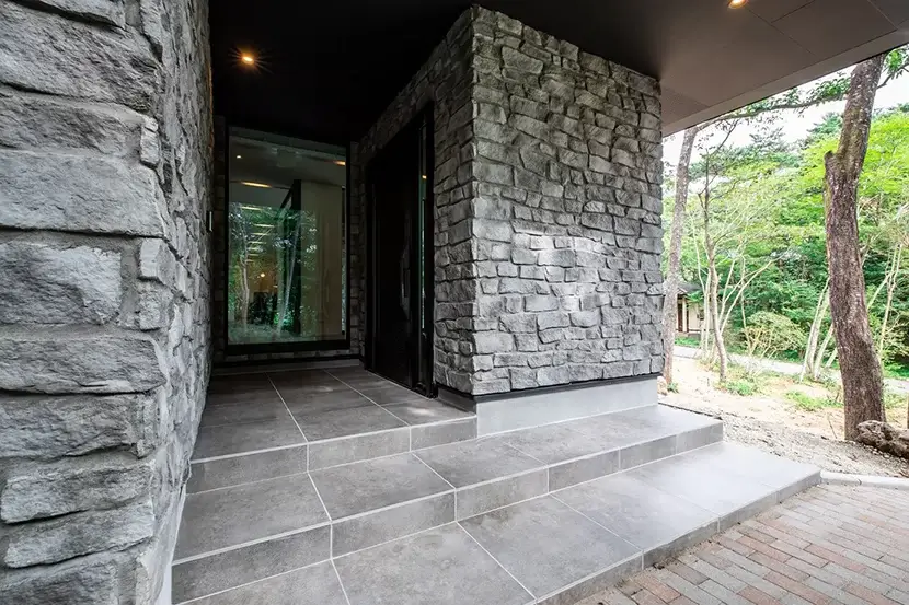 外壁の石とタイルの色を合わせて、内と外の統一感を持たせた。玄関ポーチは屋根があるので雨の日も濡れずに行き来ができて便利。家でのアウトドアも楽しめるエントランス部分は開放的なデザインとなっている。