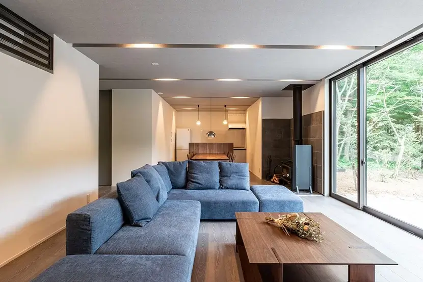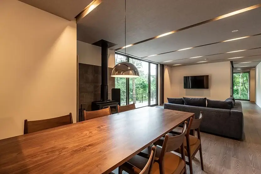 ダイニングスペースには薪ストーブを配置し、住まい全体をやわらかい暖かさが包みこむ。薪ストーブのゆらめく炎は日々の疲れを癒やしてくれるだろう