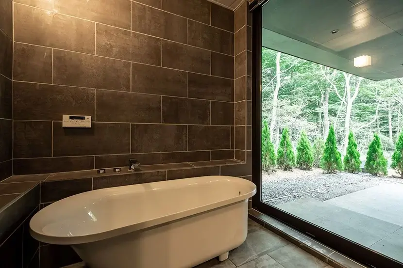 シンプルながらも素材でアクセントをつけた浴室洗面。造作洗面には広いカウンターも備え、身支度アイテムを置けるので便利。外の自然を眺めながらくつろげるホテルライクなバスルーム。