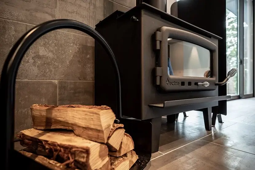 ダイニングスペースには日々の疲れを癒やしてくれる薪ストーブ
