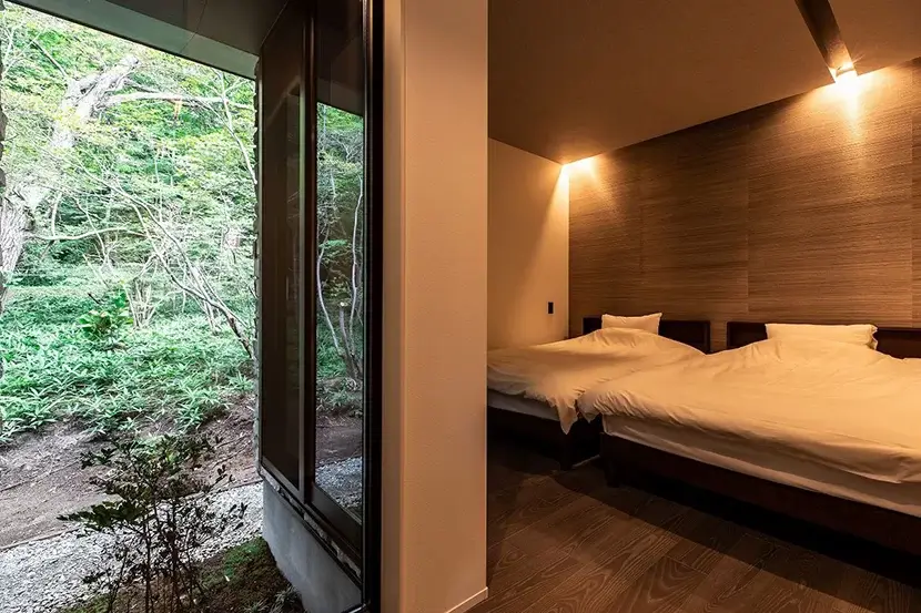 ベッドルームも大開口を設け、景色を見ながらゆったりと過ごすことができる。無駄なものを省き、ゆったりと寛げる寝室。ふとした瞬間にも自然を感じられる空間設計が見事。