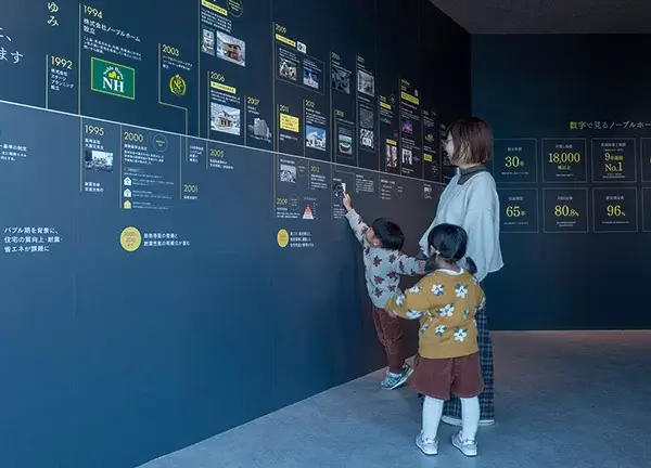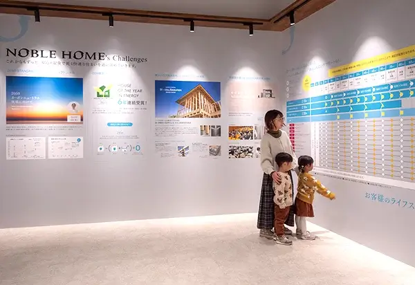 1階は未来の暮らしを体感できるフロア。受付を済ませたら、まずは今年32年目を迎えたノーブルホームの歩みを見ながら中へ入っていきます。