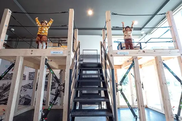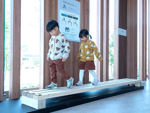 「木材エリア」では、構造材「JWOOD LVL」の強さと特長を体感。平均台のように並べてある構造材の上を歩いたり、釘抜き体験で、無垢材や一般的な集成材と比較することができます。
